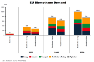 When analyzing the potential of biomethane across all sectors, the European Ten Year Network Development Plan (TYNDP) 2022 forecasts a strong increase in all scenarios for biomethane demand both across the EU and in Germany, as seen below.