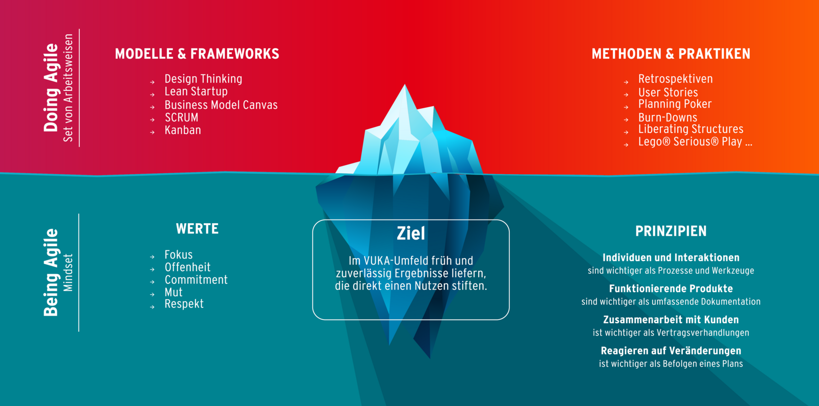 Ergebnisorientierte, nachhaltige Transformation: Unser Ziel ist es, gemeinsam mit Ihnen messbare Fortschritte zu erzielen – von ersten Quick-Wins bis zur langfristigen Verankerung agiler Prinzipien, Frameworks und Praktiken in Ihrem Unternehmen.unsere Fachexpertise in den Feldern ausdrückt (also die Kombination von methodischen und fachlichem Knowhow (als Selling Point gegenüber nicht energiewirtschaftlicher Beratungen)