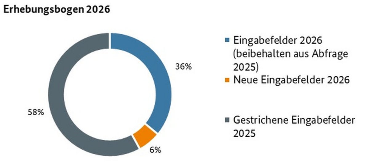 Mit der Veröffentlichung des Entwurfs hat die Bundesnetzagentur direkt auf den deutlich reduzierten Fragenkatalog aufmerksam gemacht. Im Vergleich zu 2025 entfallen 58% der Fragen und 2026 werden nur 6% neue Angaben abgefragt.