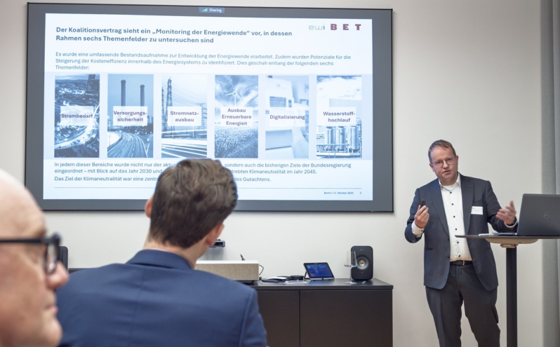 Nach der Eröffnung durch Dr. Alexander Kox, Geschäftsführer von BET Consulting, präsentierten Ralph Kremp, Partner bei BET Consulting, und Nils Namockel, Project Lead beim EWI - Energiewirtschaftliches Institut an der Universität zu Köln, die zentralen Ergebnisse des aktuellen Monitoring-Berichts.