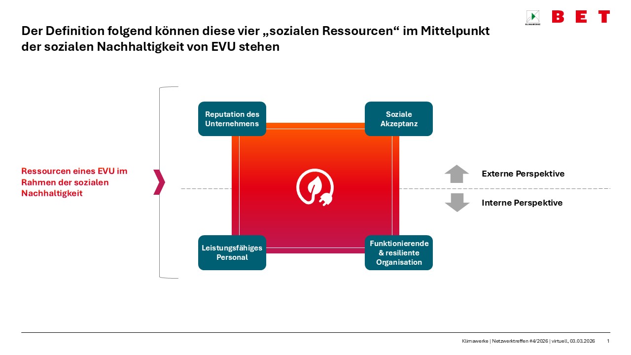 Für Energieversorgungsunternehmen (EVU) lassen sich vier zentrale soziale Ressourcen identifizieren, die im Mittelpunkt sozialer Nachhaltigkeit stehen: