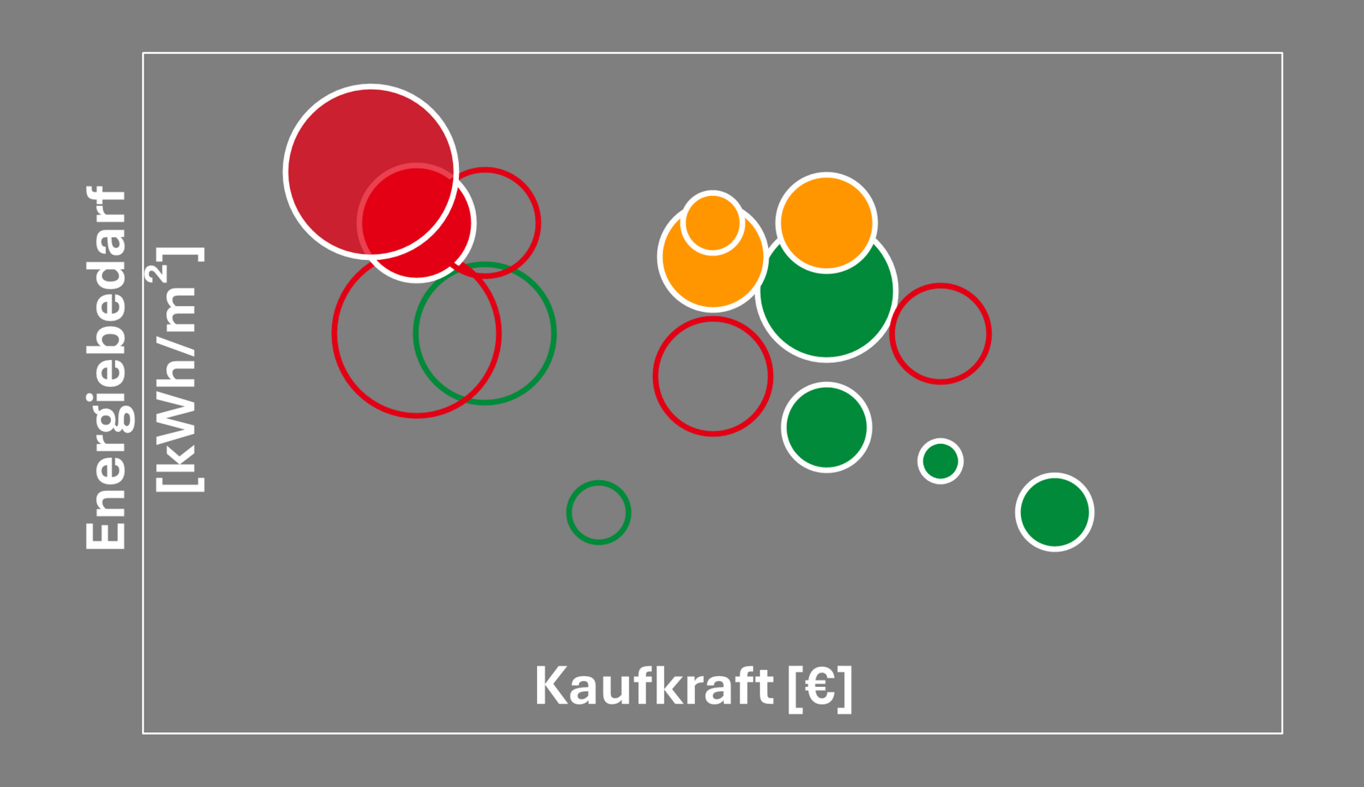 Die Abbildung zeigt die 16 Cluster in den Dimensionen Anpassungsfähigkeit (Farbe), Wohnstatus (Kreisfüllung) und Bevölkerungsanteil (Kreisgröße) entlang der Koordinaten Kaufkraft und Energiebedarf.