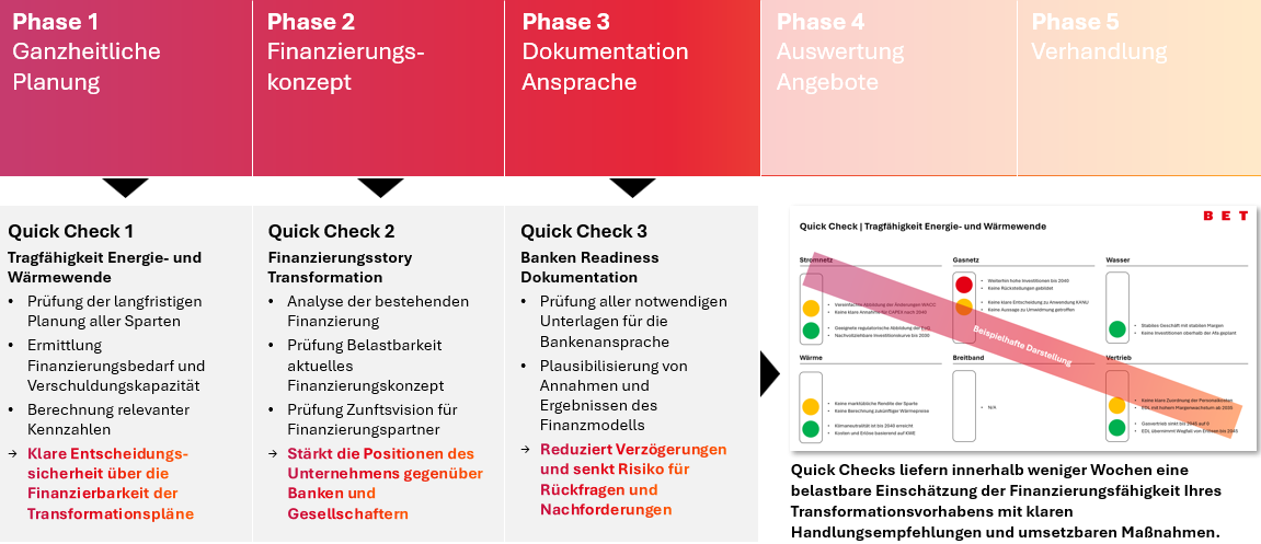 Viele Stadtwerke starten dabei keineswegs bei null. Häufig liegen bereits interne Vorarbeiten vor, doch das Gefühl, noch nicht ausreichend vorbereitet zu sein, hält sie davon ab, an den Markt zu treten. Manchmal fehlt dabei nur ein belastbares Modell, ein roter Faden in der Finanzierungsstory, eine Plausibilisierung für Banken oder schlicht ein externer Blick, der Sicherheit schafft. Für genau diese Situationen haben wir unsere Quick Checks entwickelt. Es handelt sich um kompakte Instrumente, die sich nahtlos in die internen Prozesse des Stadtwerks einfügen und genau dort ansetzen, wo der Druck am größten ist.